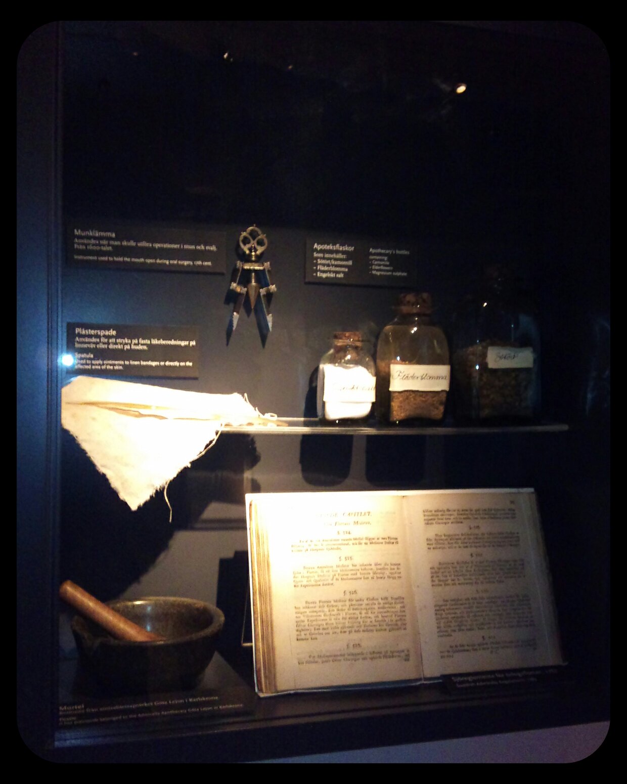 Jag är ju ganska glad åt att jag inte levde på den tiden! Salt och fläderblommor som mediciner… Bladguld mot huvudvärk, hmmm, ja det kanske funkar? Överst till vänster hänger ett verktyg som användes för operation och ingrepp i mun och svalg. *glurp*