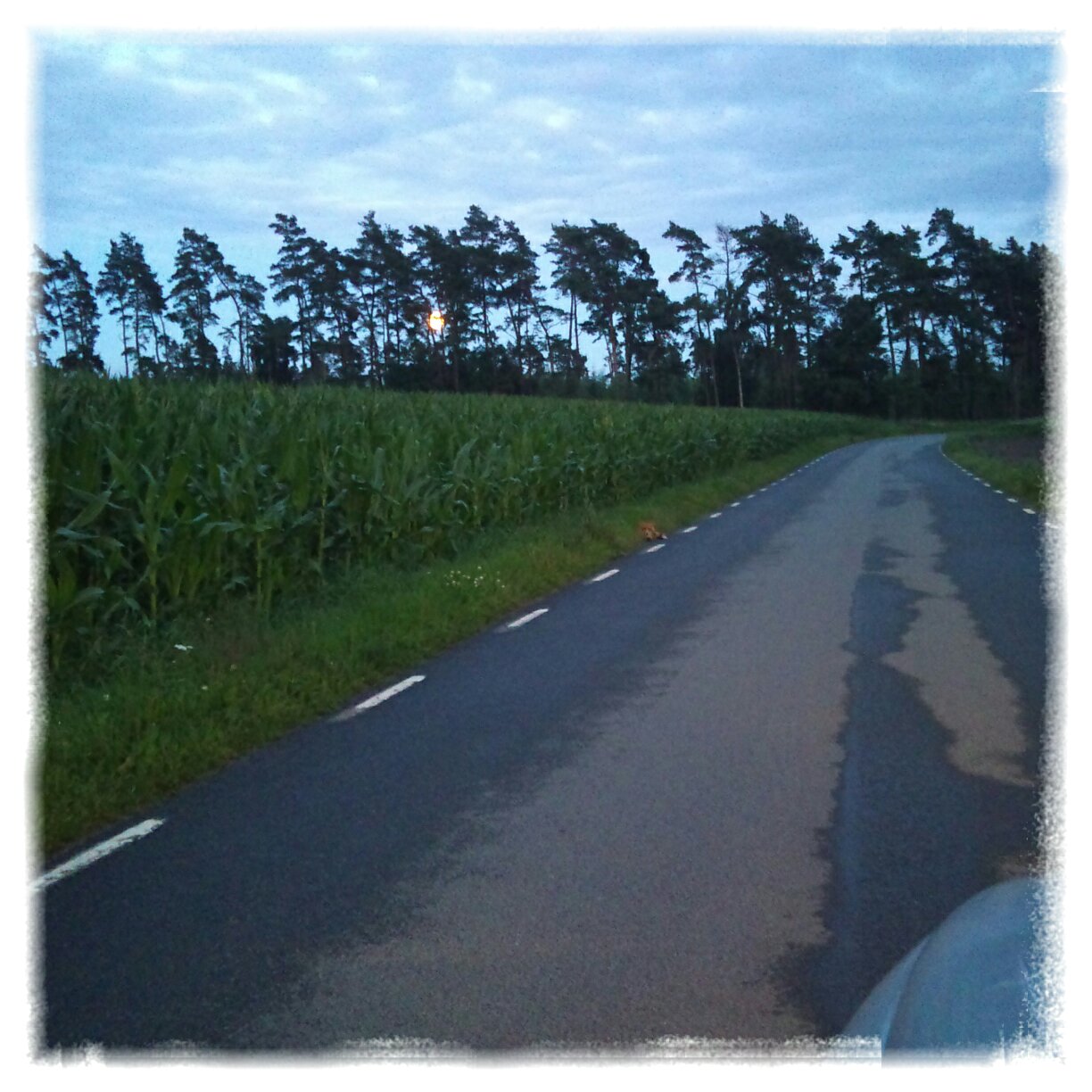 När vi lämnat av Maja och ganska trötta fortsatte vår väg hem var det lite frågan om vi såg i syne. Katt, sa Anders – räv, sa jag. Jag hade rätt. Det var inte det lättaste att stanna bilen på lagom avstånd, få upp luren, sätta igång appen och fota innan h*n gömt sig i majsen. Men den låg bara där som en liten hund och tittade på oss. När jag försökte komma närmare gick det inte – h*n stack in i majsen och gömde sig.